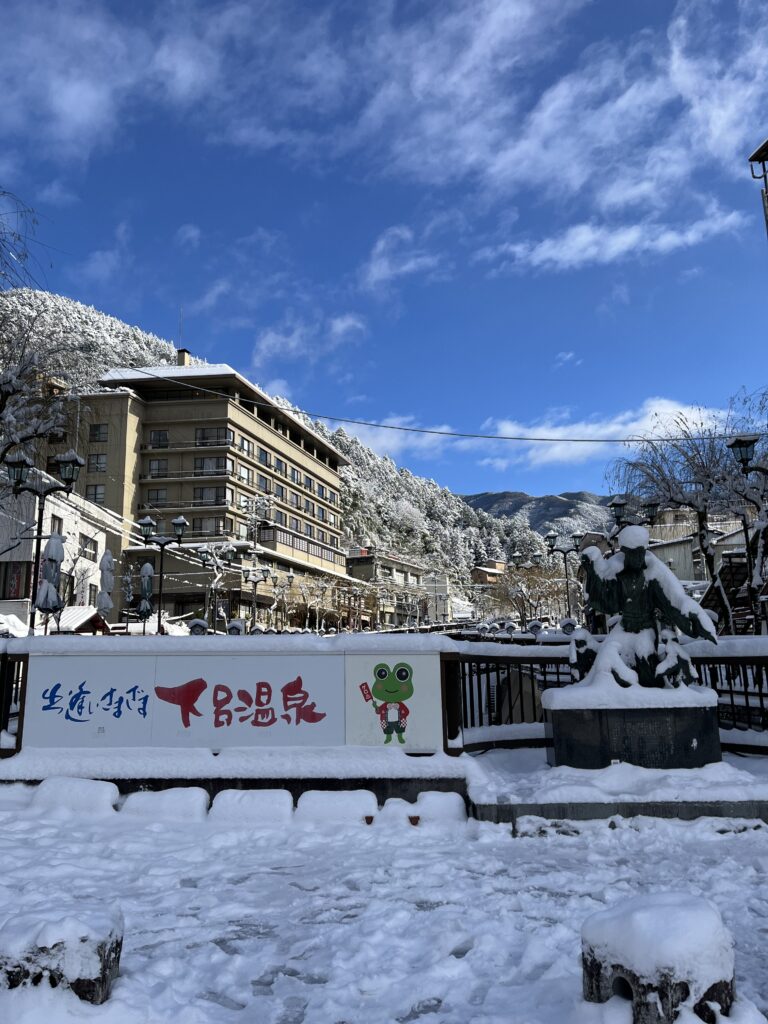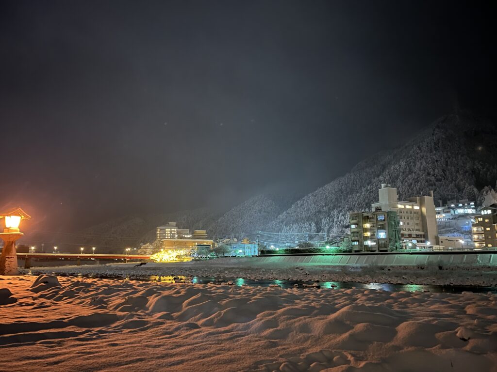 夜が明けて温泉街や河川敷をあるいていると、お客様や地元の子どもたちが作った雪だるまが量産されていてそれを見て巡っていくのも面白かったりします。